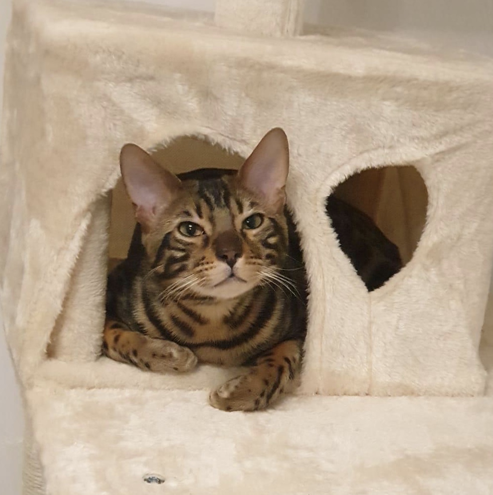 …”(Mowgli) is a delight! Very much a lap cat and sleeps on our bed. He lets us know every morning when he wants his breakfast by standing at the bottom of the stairs and meowing – loudly! He is a fantastic addition to our family and really loved by all of us (including his feline brothers and sisters). Thank you!”